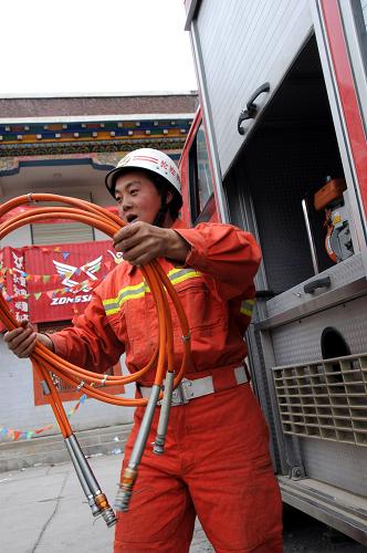 4月26日,杜仕海正在消防车前整理消防设备。新华社记者陈国洲摄