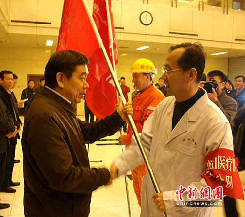 图为河北省唐山市市长陈国鹰向赶赴青海玉树灾区救灾的医疗专家吴硕岭授突击队旗。