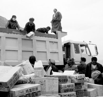 4月18日,由青海省天峻县群众捐助的物资,发放到灾区群众手中。(记者 李琛奇 摄)