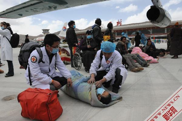 4月19日,伤员在玉树巴塘机场等待转运。记者从青海玉树抗震救灾指挥部了解到,截至4月18日8时,已有1881名地震伤员从玉树灾区转运到省内和外省医疗机构救治。新华社记者何俊昌 摄