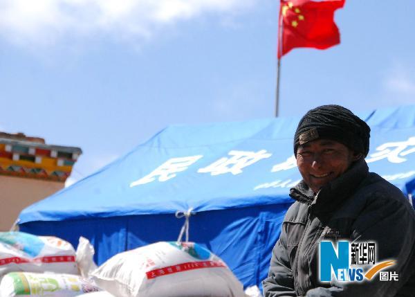 4月26日,一位玉树县隆宝镇措桑村村民在救灾帐篷前露出微笑。 新华社记者 文贻炜 摄