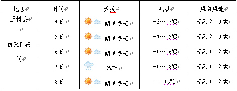 青海省气象台预计,未来三天玉树州都是晴或多云的天气,今天的气温为-3~12℃,明天和后天的气温分别为-4~15℃和-1~16℃。17日玉树县、囊谦县、称多县有阵雨,18日转为晴或多云。由于近日夜间气温较低,请在户外避险时注意保暖。