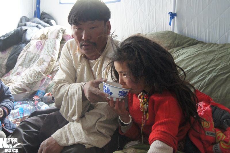 小女孩的舅舅在给她喂奶茶。新华军事记者 王玉山 摄