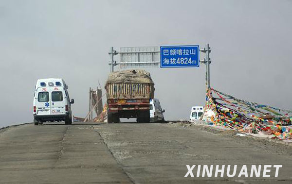 4月16日,救护车行驶在海拔4824米的巴颜喀拉山口。目前,来自全国各地的大批救援物资正源源不断地向地震灾区输送。214国道西宁至玉树的800余公里公路成为向灾区输送物资的生命线。记者历时15个小时,从西宁乘车前往玉树,目击了这条生命线的繁忙景象。新华社记者 丁海涛 摄