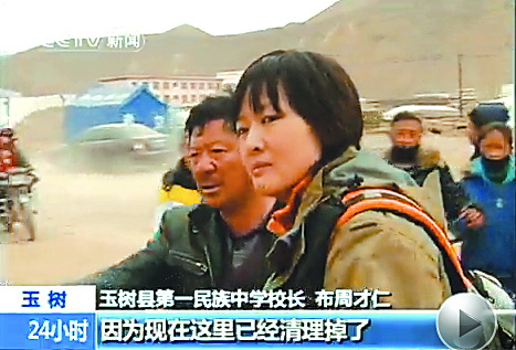 中央电视台等媒体记者在玉树地震灾区采访报道。