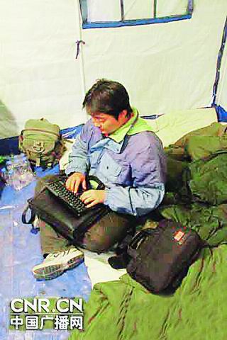 记者赵亚辉是人民日报有名的“拼命”记者。到玉树后,第二天凌晨两点多他才吃上第一顿饭,由于没有热水,吃的是干面,在头两天里,他仅休息了3个小时。他说:“发稿很不方便,有一次采访完我走了一个半小时回去发稿,有篇稿子是坐在马路上写的,更多的时候是站着写稿,把笔记本电池用完后,就到有柴油发电机的地方去蹭电,经常为写一篇稿子,在那里一站就是两三个小时,稿子传回社里,已是晚上十点多。”他介绍,在高海拔地区采访,对记者是一种严峻的考验,昼夜温差很大,晚上相当冷,再加上高原反应强烈,可真不好熬。“但我们有责任把灾区的状况及时报道出去,特别是报道好救人的信息。”人民日报的读者都还记得,赵亚辉曾参加过汶川地震报道,当时在地震发生后的4天时间里,他总共没吃上几口饭,平均每天休息不到两小时,历尽艰险,因劳累过度病倒了,在医院输液时,他还带着采访本,边治疗边采访医护人员。玉树地震后,他又主动请缨来到前线。