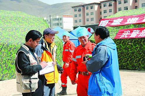 人民日报等媒体记者在玉树地震灾区采访报道。