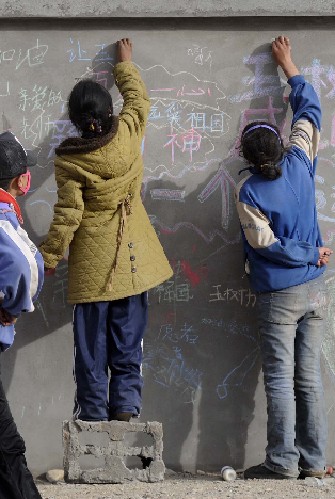 在青海省玉树县结古镇新建路,有一段地震中幸存的水泥墙。近两天,这段墙下多了两个藏族小姐妹,她俩把墙当成黑板,用彩色粉笔在上面写,在上面画,使这段墙成了姐妹俩表达对抗震救灾真实感受的“心声墙”。