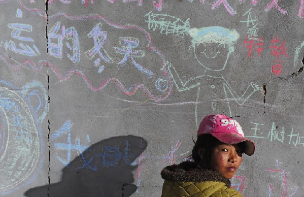 家园的毁坏、乡亲的遇难,让两个懂事的孩子忍受着巨大悲痛,她们写道,“一个永远难忘的冬天”,并用两组画表达了怀念的心声。一组画的是表情哭和笑的人头像,伊西永措说,表达的是对亲友遇难的悲痛和抗震救灾胜利的欢喜;另一组画的是两个人,尼玛卓玛说,画的是她们各自的汉语老师,因为到现在还不知道两位老师的下落。
