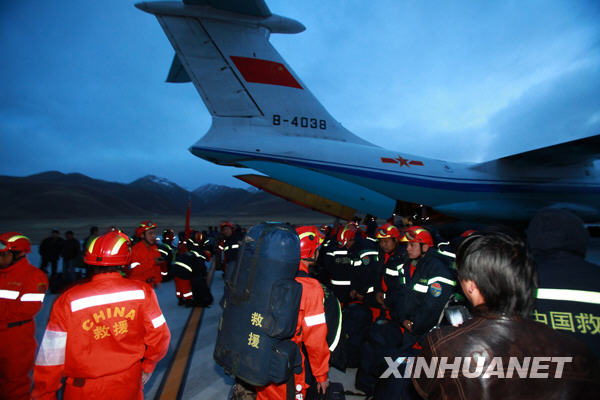 当晚,中国国际地震救援队乘坐两架空军伊尔-76运输机,抵达青海玉树机场。新华社发(谭超摄)
