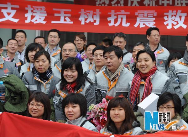 4月15日,医疗队员临行前在北京南苑机场合影。当日,北京第一批急救医疗队赶赴青海玉树地震灾区开展救援。急救医疗队由来自北京大学第一医院、北京大学第三医院、北京大学人民医院、北京积水潭医院、北京朝阳医院、北京儿童医院和北京急救中心的60余名医护人员组成,包括临床骨科、普外、脑外、肾内、胸外等专业,同时携带近8吨的急救物资和生活用品。新华社记者李文摄