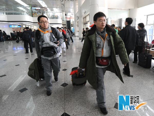 4月15日,医疗队员在北京南苑机场准备出发。当日,北京第一批急救医疗队赶赴青海玉树地震灾区开展救援。急救医疗队由来自北京大学第一医院、北京大学第三医院、北京大学人民医院、北京积水潭医院、北京朝阳医院、北京儿童医院和北京急救中心的60余名医护人员组成,包括临床骨科、普外、脑外、肾内、胸外等专业,同时携带近8吨的急救物资和生活用品。新华社记者李文摄