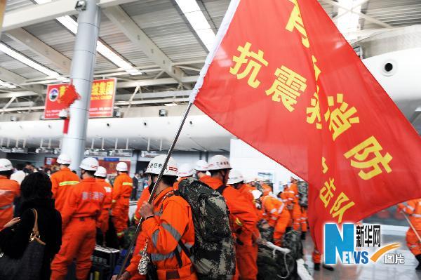 4月15日,山东地震救援队在西宁曹家堡国际机场集结。青海玉树发生地震后,山东公安消防总队在全省范围内调遣的192名救援队员,25条搜救犬,携带生命探测仪等搜救工具在西宁曹家堡机场集结,并准备于当日下午乘专机赶往玉树灾区开展救援行动。