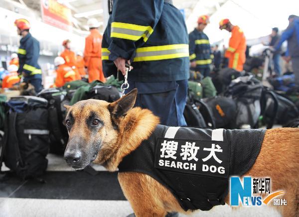 4月15日,山东地震救援队携搜救犬在西宁曹家堡国际机场集结。新华社记者 李紫恒 摄