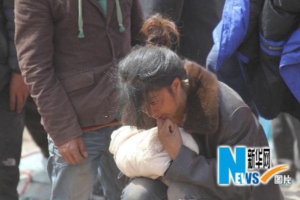 4月15日,在玉树县结古镇,一名妇女坐在废墟上等候被救援亲人的消息。 新华社记者 邢广利 摄