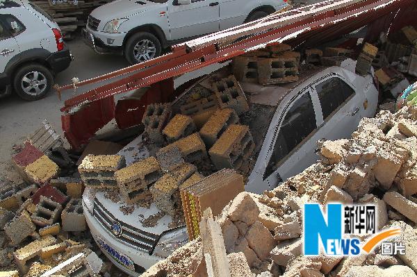 这是一辆地震中被砸毁的汽车(4月15日摄)。 新华社记者 邢广利 摄