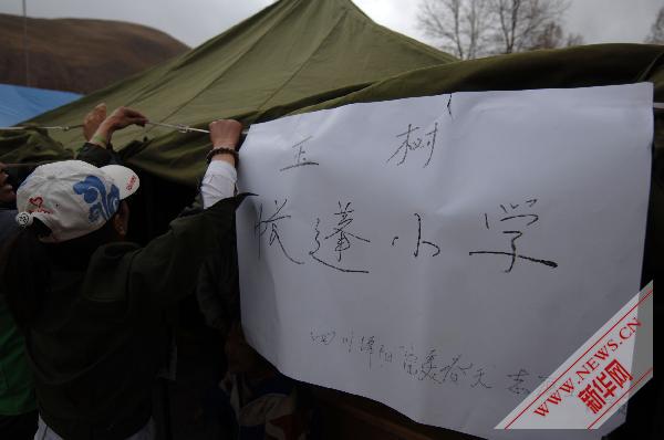 4月20日,在玉树县第二完全小学,志愿者将标牌挂在帐篷前。