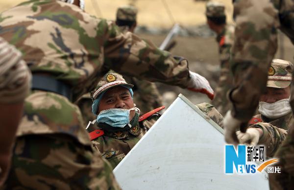4月22日,武警战士在帮助牧民铁尕搬运从他家废墟中清理出来的冰箱。新华社记者 费茂华摄