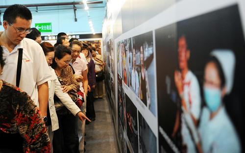 8月6日,观众在观看平息“7·5”事件纪实图片展。 新华社记者 沙达提 摄