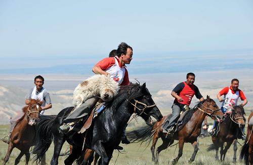 8月16日,选手们在激烈的叼羊比赛中。8月16日,一场由哈萨克和蒙古族牧民参加的叼羊比赛在新疆乌苏市天山脚下的赛力克提牧场举行。叼羊是哈萨克族传统的体育项目,为了增进各民族的团结和友谊,丰富农牧民群众的精神文化活动,当地每年都举办蒙古族的那达慕大会、哈萨克族的叼羊比赛和姑娘追等少数民族传统体育活动。新华社发(江文耀 摄)