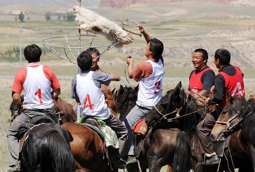 在叼羊比赛中,把羊扔进“锅”中的队伍可得到1分(8月16日摄)。新华社发(江文耀 摄)