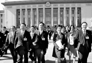 10月15日中午,在聆听了胡锦涛总书记的报告后,十七大上海代表满怀信心步出人民大会堂。 郭天中 摄