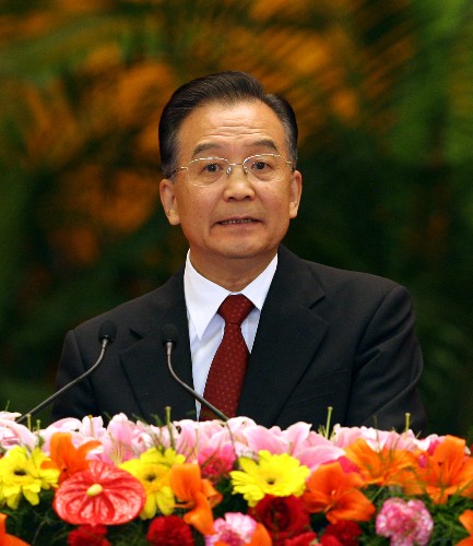 9月30日,国务院在北京人民大会堂举行国庆招待会,热烈庆祝中华人民共和国成立58周年。胡锦涛、吴邦国、温家宝、贾庆林、曾庆红、吴官正、李长春、罗干等党和国家领导人与1500余名中外人士欢聚一堂,共庆佳节。国务院总理温家宝发表热情洋溢的讲话。新华社记者 马占成 摄
