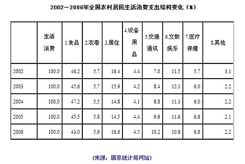 一是恩格尔系数下降。2006年城镇居民、农村居民恩格尔系数分别比2002年下降1.9%、3.2%。