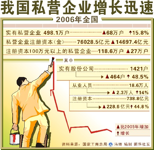 数字显示,中国的私营企业正迎来速度最快的发展期。到去年底,全国登记注册的私营企业达到495万户,占全国企业总数的57%,注册资金总额达7.5万亿元人民币。非公企业对缓解中国的就业压力也发挥着很大的作用。
