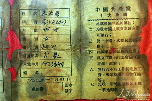 一本周边被烧焦的中华苏维埃时期的中国共产党党证,上面印有中国共产党十大政纲及五星镰锤图。这本党证的持有者是一位名叫朱王秀的女共产党党员,1933年4月入党,贫农出身,入党时只有23岁。