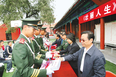 中宣部宣教局组织编写的《壮丽人生》大型画册由学习出版社出版。画册收入了党的十六大以来集中宣传的30位全国重大先进典型。图为今年10月10日,中宣部的同志向国旗护卫队赠送《壮丽人生》画册。新华社记者 李涛 摄