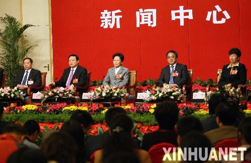 10月20日,北京十七大新闻中心举办主题为“重视未成年人教育”的集体专题采访活动,十七大代表袁贵仁(左二)、于幼军(左三)、黄晴宜(右三)、胡春华(右二)、赵实(右一)接受媒体采访。 新华社记者 李涛摄