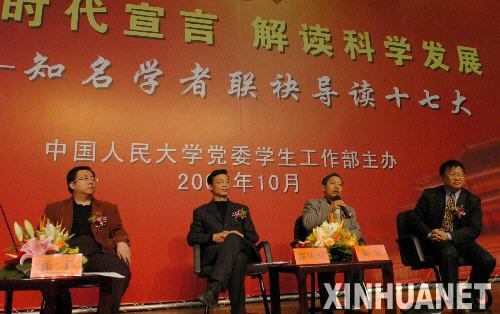 当日,中国人民大学举办 “领会时代宣言 解读科学发展――知名学者联袂导读十七大”专题报告会。知名教授对胡锦涛同志向大会所作的报告进行解读,与同学们交流十七大精神的学习心得。 新华社记者 季春鹏 摄