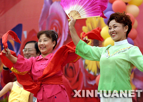 当日,“颂歌向着太阳唱――南京群众欢庆党的十七大”大型群众演唱会在南京水木秦淮广场举行。一些文艺工作者和社区群众载歌载舞,欢庆党的十七大胜利闭幕。 新华社记者 孙参 摄