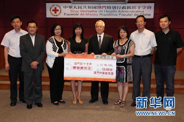 8月13日,澳门中华教育会向澳门红十字会捐赠10万澳门元,援助甘肃舟曲受灾群众。截至当日,澳门红十字会共收到澳门社会各界向舟曲灾区的捐款373.06万澳门元。 新华社发 (张金加摄)