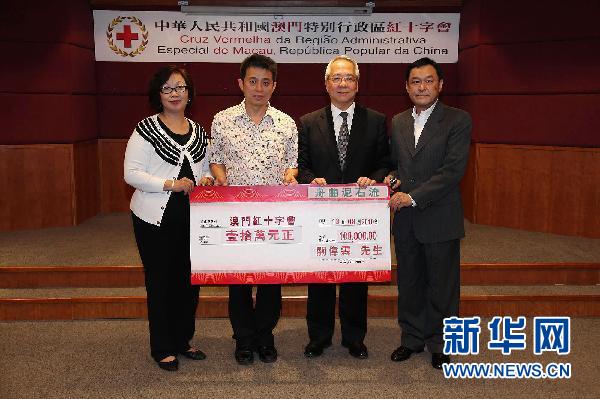 8月13日,澳门市民关伟霖向澳门红十字会捐赠10万澳门元,援助甘肃舟曲受灾群众。截至当日,澳门红十字会共收到澳门社会各界向舟曲灾区的捐款373.06万澳门元。 新华社发 (张金加摄)