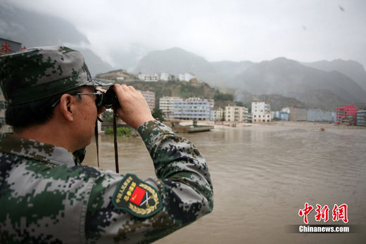 8月13日14:50分,兰州军区某集团军“开山斧”工兵团已对白龙江舟曲段实施了5次爆破,疏通因泥石流等淤泥淤积堵塞的白龙江河道,在排除洪涝险情的同时,应对今日20时前过境的新一轮洪峰。图为观察江面变化情况。中新社发 刘忠俊 摄