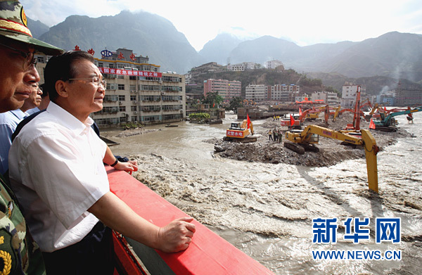 8月21日至22日,中共中央政治局常委、国务院总理温家宝再次来到舟曲灾区,看望受灾群众,慰问坚守救灾一线的部队官兵,实地指导抢险救灾和恢复重建工作。这是8月22日,温家宝在白龙江上的城江大桥察看堰塞湖治理情况。新华社记者 姚大伟摄