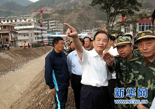 8月21日至22日,中共中央政治局常委、国务院总理温家宝再次来到舟曲灾区,看望受灾群众,慰问坚守救灾一线的部队官兵,实地指导抢险救灾和恢复重建工作。这是8月22日,温家宝来到受灾严重的舟曲县罗家峪,了解应急抗洪明渠抢修进展情况,研究下一步救灾措施。新华社记者 刘卫兵摄