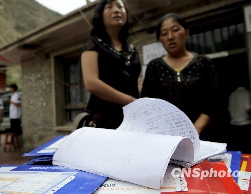 8月12日,甘肃舟曲泥石流灾区,舟曲一中收发员刘春娟(右)在学校整理送来的录取通知书。刘春娟的妈妈和弟弟在此次泥石流灾害中遇难。 中新社发 廖攀 摄