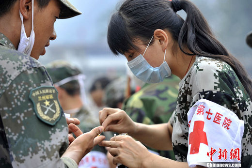 8月12日上午,甘肃舟曲灾区继续下着小雨,解放军第七医院医疗队的几名女兵穿梭救援现场,帮助救援人员处理伤口。中新网记者 金硕 摄