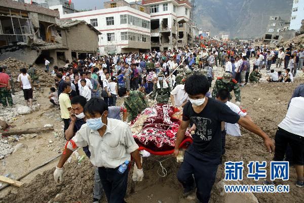 8月9日,在甘肃舟曲灾区,救援人员搬运一名遇难者遗体。