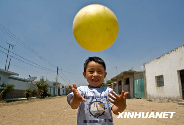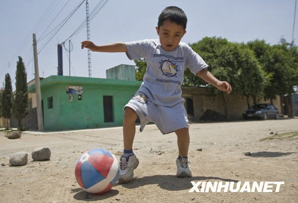 5月8日,在墨西哥韦拉克鲁斯州拉格洛利亚村,墨西哥首位人感染甲型H1N1流感患者埃德加·恩里克·埃尔南德斯在家门口玩耍。新华社发(戴维摄)