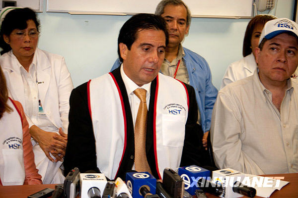 5月14日,巴拿马总统马丁·托里霍斯(前排中)在视察收治甲型H1N1流感患者的巴拿马城圣托马斯医院后召开新闻发布会,承诺加大力度防控甲型H1N1流感。截至北京时间5月15日9时,巴拿马公布的该国甲型H1N1流感确诊病例达39例。新华社发(韩硕摄)