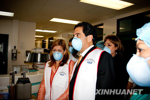 5月14日,巴拿马总统马丁·托里霍斯(中)在卫生部长罗萨里奥·图尔纳(左)的陪同下视察收治甲型H1N1流感患者的巴拿马城圣托马斯医院。马丁·托里霍斯在随后召开的新闻发布会上承诺加大力度防控甲型H1N1流感。截至北京时间5月15日9时,巴拿马公布的该国甲型H1N1流感确诊病例达39例。新华社发(韩硕摄)