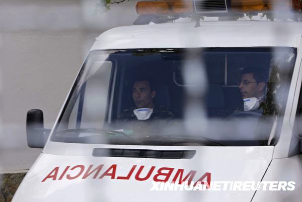 5月25日,在西班牙首都马德里郊外的奥约-德曼萨纳雷斯,一辆救护车在一所军事院校内行驶。据路透社报道,这所军事院校内确诊19例甲型H1N1流感病例,450余名士兵因此被隔离在校园内不得外出。新华社/路透