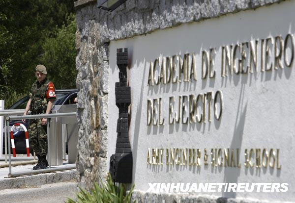 5月25日,在西班牙首都马德里郊外的奥约-德曼萨纳雷斯,一名士兵在一所军事院校门外警戒。新华社/路透