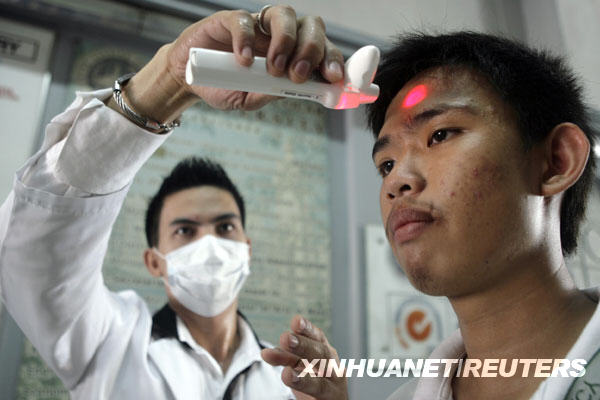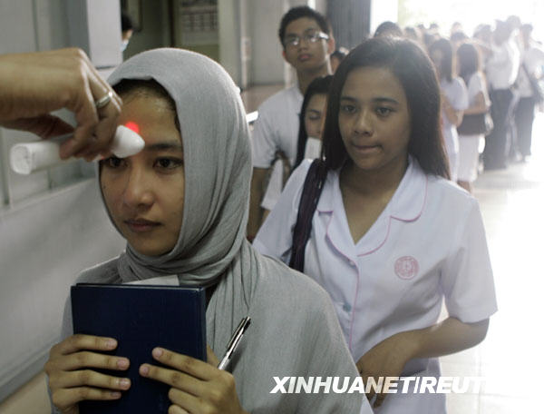 6月15日,在菲律宾首都马尼拉的一所大学,一名学生入校前接受体温测量,以防范甲型H1N1流感疫情。截至北京时间6月15日14时,世界卫生组织共确认菲律宾甲型H1N1流感确诊病例77例。新华社/路透