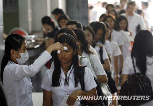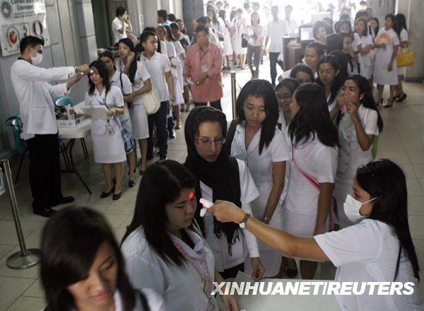 6月15日,在菲律宾首都马尼拉的一所大学,学生们入校前接受体温测量,以防范甲型H1N1流感疫情。截至北京时间6月15日14时,世界卫生组织共确认菲律宾甲型H1N1流感确诊病例77例。新华社/路透