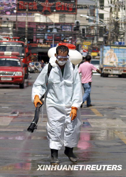 6月14日,泰国卫生工作人员在普吉岛一处海滩附近喷洒消毒药水。泰国卫生部当日宣布,泰国新确诊甲型H1N1流感病例44例,这使得泰国甲型H1N1流感确诊病例增至150例。新华社/路透